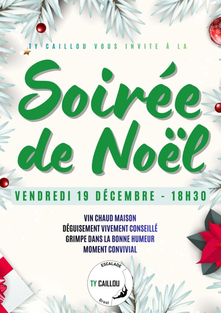 Le vendredi 19 décembre nous convions nos adhérents à une séance de grimpe sur le thème de Noël. Venez avec une petite touche nous rappelant ces fêtes de fin d’année ! Nous aurons l’occasion de prendre un vin chaud à la fin de la séance !